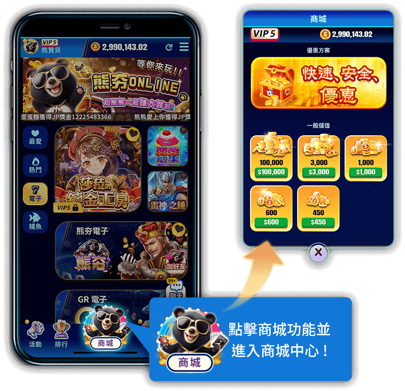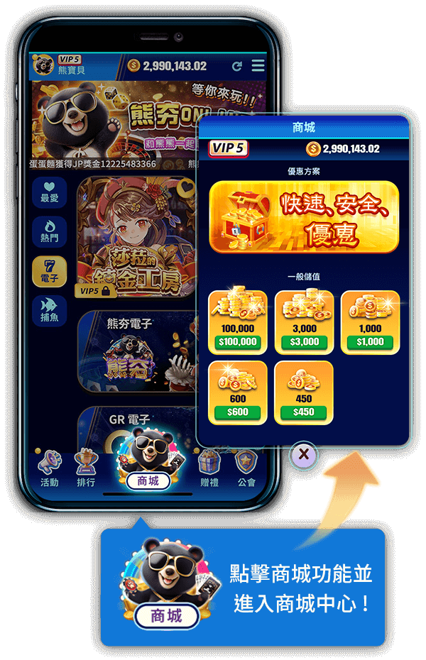 步驟一:請點擊下方【商城】入口,將會開啟商城畫面,即可進行儲值。